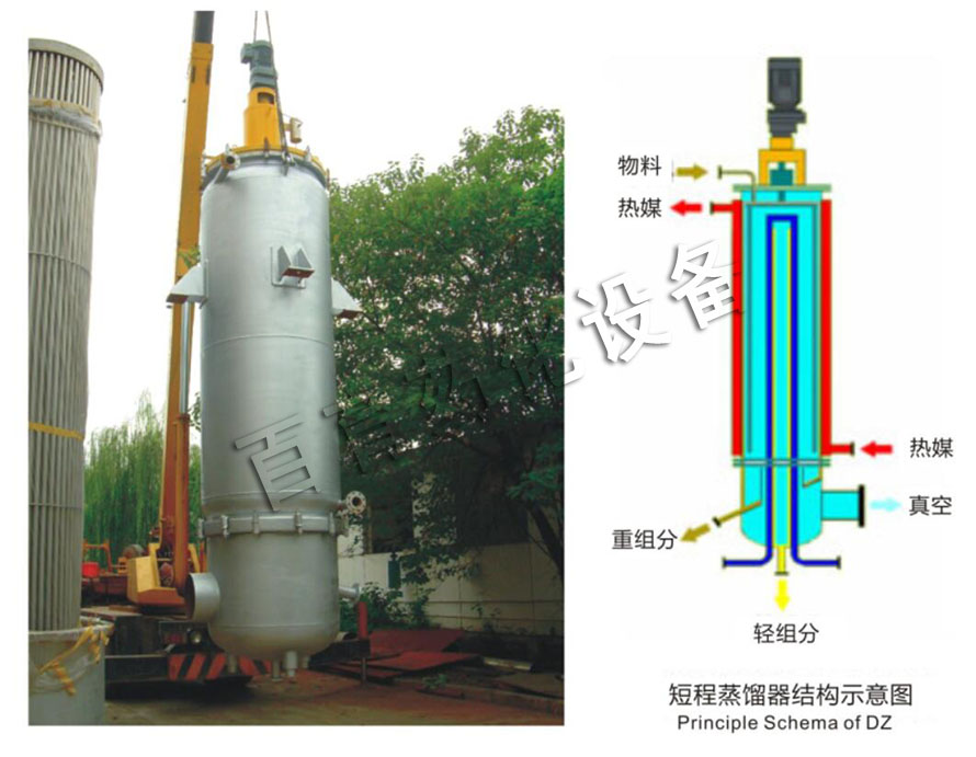 短程分子蒸餾設(shè)備的蒸餾是一種在高真空(<10Pa)條件下,在加熱面上被蒸發(fā)的分子經(jīng)過(guò)盡可能短的距離到達(dá)冷凝面進(jìn)行冷凝,從而實(shí)現(xiàn)液-液分離的蒸餾過(guò)程。當(dāng)加熱面與冷凝面的距離小于或等于操作真空和溫度下的被蒸發(fā)分子的平均自由程時(shí),該蒸餾過(guò)程也被稱為分子蒸餾。它具有蒸餾溫度低、蒸餾真空度高、受熱時(shí)間短、分離程度高等優(yōu)點(diǎn),是一種較新的尚未廣泛運(yùn)用于工業(yè)化生產(chǎn)的分離技術(shù)。